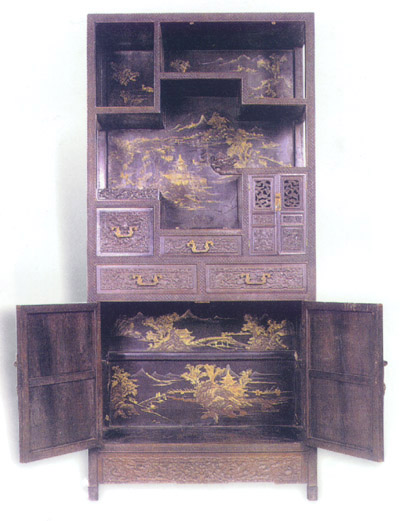 清代的家具,随着时尚的变化,结构形制淅趋复杂。此柜是书柜与多宝格相结合,结构复杂,装饰繁琐,连书柜内部都饰满花纹。