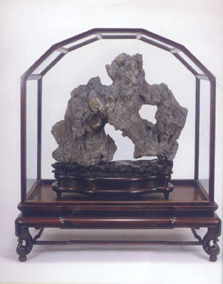 床式底座为紫檀而做,外层套架座用红木做成,通高430mm。奇石野逸散淡,架座高雅风流,两者不可分离。