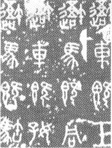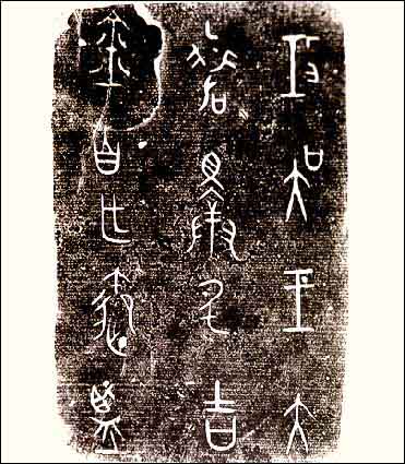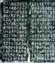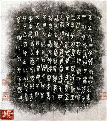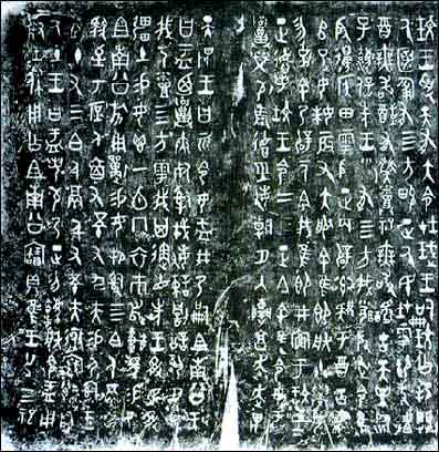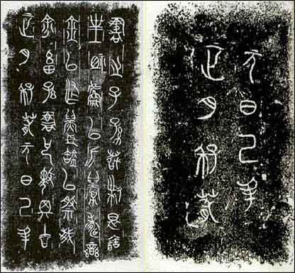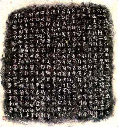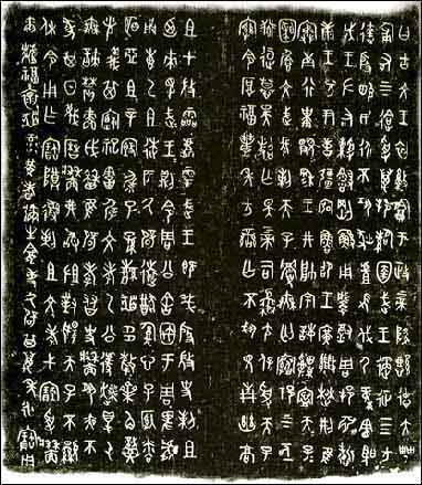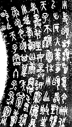 东周石鼓文 为战国时代秦国刻石。石鼓共有十枚,形似鼓状,每件石鼓上以籀文刻四言诗一首,共十首,其内容为记述秦王游猎之事,故石鼓又称为猎碣。字迹磨损很多,今藏在北京故宫博物馆。《石鼓文》在书法史上有承前启后的重要地位。它的字体是典型的秦国书风,并对后来秦朝小篆的出现产生了很大影响。同时其本身的艺术成就也很高,它的结体方正匀整,舒展大方,线条饱满圆润,笔意浓厚,在《石鼓文》字里行间已经找不出象形图画的痕迹,完全是由线条组成的符号结构。本图为《石鼓文》局部。