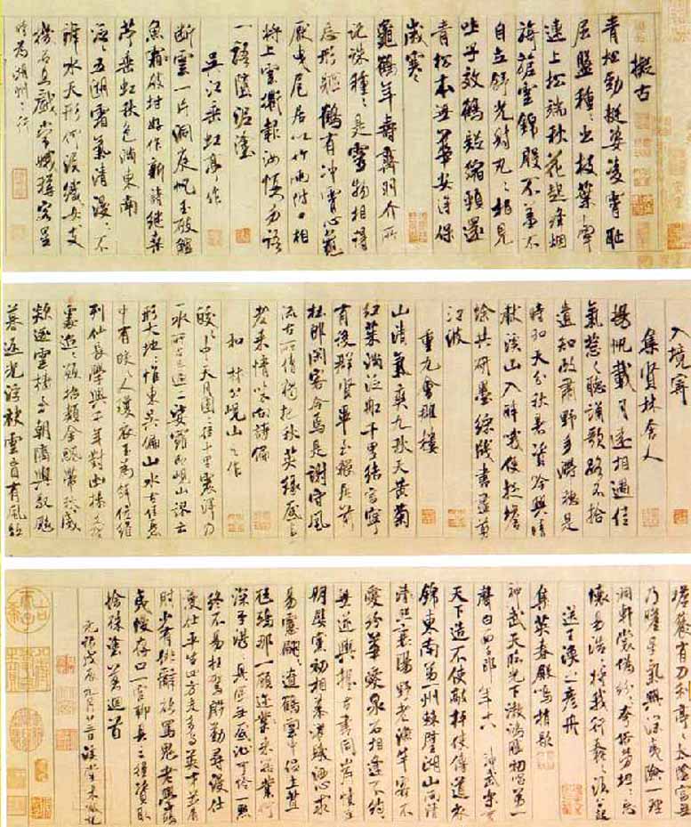 米芾《蜀素帖》,亦称《拟古诗帖》,墨迹绢本,行书。纵29.7厘米,横284.3厘米;书于宋哲宗元祐三年(1088),米芾三十八岁时,共书自作各体诗八首,计71行658字,署黻款。