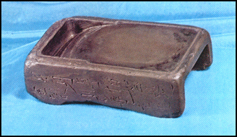 砚,在西汉时期即已使用,湖北荆州凤凰山西汉墓出土了砚,我国传统有四大砚,即端砚、歙砚、洮砚、澄泥砚。端砚产于广东端州(肇庆市)东郊端溪,唐代就极出名,李贺有诗日:“端州石工巧如神,踏天磨刀割紫云”,赞石工攀登高处凿取紫色岩石来制砚。端砚有“群砚之首“的称誉,石质细腻、坚实、幼嫩、滋润,扪之若婴儿之肤,。温润如玉,磨之无声,发墨光润。石上且有鸲鹆眼等自然纹理,歙砚产于徽州,徽州是府治,歙县是县治,同在一地。所以歙砚与徽墨乃是“文房四宝”中同产一地的姐妹。歙砚的特点,据《洞天清禄集》说:“细润如玉,发墨如饥油,并无声,久用不退锋。或有隐隐白纹成山水、星斗、云月异象。”端砚资源缺乏,名贵者已不多;歙县地处黄山之阳,取材广泛,近年仍有镂刻工极细之艺术大砚出产。洮河砚之石材产于甘肃临洮大河深水之底,取之极难。澄泥砚产于山西绛州,不是石砚,而是用绢袋沉到汾河里,一年后取出,袋里装满细泥沙,用来制砚。另有鲁砚,产于山东;盘谷砚,产于河南;罗纹砚,产于江西。一般说,凡石质细密,能保持湿润,磨墨无声,发墨光润的,都是较好的砚台。