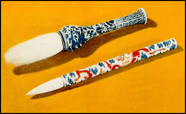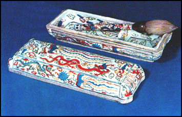 明万历五彩龙凤纹瓷管羊毫笔和笔盒