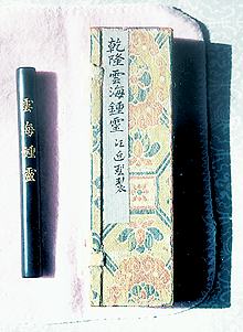 值得一提的是,其子惟高曾应诏在清廷御书处教习制墨“法必宗于古,式必从其新”,所制皆“称旨”,因之名声鹊起。其高档墨中掺有珍珠、赤金、玉屑、犀角、麝香、冰片等贵重药物,故在我国古老的医药学中,徽墨具有一定的医药价值,是当时家庭中必备的一种防病治病的最佳“药品”,自古以来深受广大群众的喜爱。张书勋有诗赞曰:“歙县多名家,汪氏尤杰出,黄山千尺松,作糜质,轻烟细若雾,奇观黝如漆。上追唐李奚,父子相继述,珍重遍艺林,声华达帝室……”苏轼与秦少游,心照不宣,爱墨藏墨,亦以“秦郎百好俱第一,乌丸如漆姿如石”来赞美此墨丸的。 图为一丸出自清代制墨大家汪近圣的墨宝,圆柱形,长仅9厘米。直径8毫米,分两面镌文“云海钟灵”、“汪近圣造”共八个楷体金字,干净利落,简约端庄,外用黄底锦缎盒包装,盒面手书“乾隆云海钟灵汪近圣制”的标识,相当精致典雅。 少 求