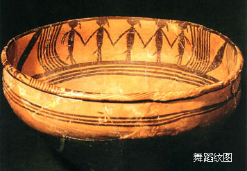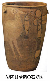 【彩陶画】 描绘在彩陶上的图绘主要分为几何图案和带有写实倾向的人物、动物图像两类,彩陶画指的是后一类图像。这类图像虽然也是属于陶器上的装饰,但以其写实性的描绘,体现出一定的构思、想象甚至是某种主题,因而与单纯的几何纹装饰图案有重大区别。 河南临汝阎村仰韶文化遗址出土的一件彩陶缸上绘有一只白鹳衔鱼,面向一柄装饰考究的石斧而立。此画被称为“鹳鱼石斧图”,其图像组合明显具有一种主题意念,有研究者认为它记录了以鹳为图腾的氏族战胜、兼并了以鱼为图腾的氏族的历史性事件。画面为37.44厘米,构图均衡、饱满,形象简洁醒目,为史前独立性绘画中的珍品。 青海大通县上孙家寨马家窑文化遗址出土有一件舞蹈人物彩陶盆,其内沿画着一圈3组、每组5个人手挽手跳舞的情景,5个相同的人物形象和朝向的统一,表现了舞蹈的整齐节奏,透露出欢快热烈的气氛。有学者认为这是表现了氏族成员分组围猎野兽的场景,也有人认为是载歌载舞庆祝丰收或祭祀神灵。在技法上,这件作品紧紧抓住人物的动态和整齐的队形,以极其精练的笔墨进行描绘,每组人物之间和人物脚下的各种线条变化自然,富有抒情的意念。