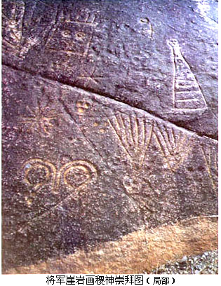 阴山岩画的题材内容多为动物、狩猎、战争、舞蹈、天文图像及神灵图像等,制作技法均为敲击、磨刻,形象古拙生动。连云港将军崖崖画也是刻制,有人面、兽画、农作物、太阳、星云等图像以及一些抽象符号,风格简率、生动,其内容可能与祈求丰收和祭天的宗教观念有关。