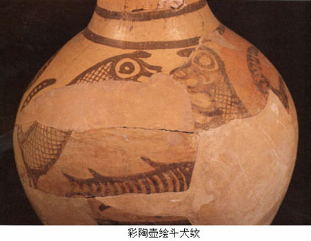 彩陶上还有鱼纹、鸟纹、蛙纹、犬纹等图像,往往都是抽象与写实相结合,具有浓厚的绘画意趣。如半坡彩陶中有一件陶盆外壁绘有3条首尾相接的大鱼,那种张嘴露齿、体态优悠的情状,以及笔墨上的简练、流畅、老练,在审美上给人以不小的震撼。又如甘肃省甘谷县西坪马家窑文化遗址出土的一件彩陶瓶上,绘有一条人面状的鲵鱼(俗称娃娃鱼),构图独特,表情强烈,而用笔生动,笔触豪放,明显表现出笔墨的意趣。