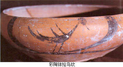 【线刻画】 这是以硬度较高的工具在石器、骨器及陶器上刻划的阴刻图像。虽然它们的制作看起来具有工艺或雕刻的性质,但从图像本身来看仍不失为具有独立性的绘画图像。浙江余姚河姆渡遗址出土的鸟纹骨匕,其中心部位刻两组对称的双鸟,为有冠、勾喙、大眼、蹼足、修尾的水禽,姿态生动,特点鲜明,具有写实与装饰相结合的意趣。另外同在河姆渡遗址出土的猪纹陶钵、双凤朝阳纹牙刻蝶形器、稻穗植物纹陶盆等,都显示出同样的特色,其中那件猪纹陶钵尤为有趣,猪的外形基本写实,但猪身上的毫毛却被画成圆圈纹和花叶纹,这种艺术加工手法在后来的民间绘画中成为一种富有民族特色的传统。 壁画与地画 壁画与建筑物的存在紧密相连。目前仅知有两处史前壁画的遗迹。辽宁凌源县牛河梁红山文化遗址的女神庙建筑遗存中发现有壁画残块,是中国迄今所知最古老的壁画遗迹。它是在压平的壁面上,绘上赭红间黄白交错的三角纹几何图案和用赭红色画成勾连纹图案。另一处壁画遗迹是在宁夏固原店河村齐家文化遗址的一座房屋残垣的白灰面上,曾发现用红彩描绘的几何纹。这些壁画残迹反映出史前人们已懂得利用彩绘图案装饰建筑壁面,虽然还不是主题性的绘画,但可以视为中国壁画传统最古远的源头。 地画其实难以构成一个绘画种类,这里介绍的是一个特殊的绘画遗迹。1982年在发掘清理甘肃秦安大地湾仰韶文化晚期遗址时,发现在一处长方形房址的白灰地面上,有以炭黑颜色绘成的图画。画面绘有两个人物(一说为三人),有披发,身后似有尾饰(一说为手握棍棒);图下方有一长方形框,框内有两物,似为两只昆虫,也有说是两只动物。另外一个与地面装饰有关的特例是在河南濮阳两水坡仰韶文化早期墓葬里发现的用蚌壳摆砌出来的、分列于死者尸骨两旁的龙虎形象,是目前所见最早的龙的形象。这是对墓葬进行装饰的最早实例,必然蕴含有很深的用意。