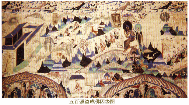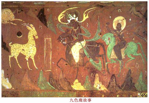 在构图上,巨大的画幅上各部分布局得当,既有独立又有前后呼应,首尾衔接,成功地交织出一个个充满变化与流动氛围的宏大场面。众多的人物形象准确地描绘出各种不同角度的姿态、神情,许多人像写实严谨、生动传神,堪称杰出的肖像之作,而不少人像的脸型以拉长的橢圆形为特征。鞍马皆壮健骠悍,一派腾跃、浩荡的生机,其中更有转首凝视、形神兼备的骏马形象。在技法上,采用勾线与色彩晕染结合的手法,线描用笔娴熟,线条流畅遒劲;色彩晕染有致,有些形象还运用明暗渲染法,产生丰富生动的艺术效果。通过形象特征、艺术风格和水平等因素的比较研究,不少学者推测娄睿墓壁画可能出于北齐著名画家杨子华之手。 其他如洛阳北魏元义墓墓室的天象图,是研究中国古代天文学的重要资料;河北磁县东魏茹茹公主墓壁画中皇室仪卫的威严肃穆与鬼神灵怪的满壁风动,显示出东魏墓室壁画的精湛技艺;宁夏固原北周李贤墓壁画中威风凛凛的仪卫武士和神情自若的女侍,可见勾线晕染技法的纯熟运用。 河南邓县南朝墓中有彩绘壁画,也有彩色画像砖。其彩绘壁画为墓门上方的兽面与飞仙、墓门两侧各一拄剑门吏,形象生动,有南朝“秀骨清像”的风格特征。 【石窟壁画】 在一片佞佛风气之中,当时不少著名画家都参加了寺庙壁画创作,这些寺庙壁画代表了当时绘画水平,可惜年代久远,这些寺庙壁画早已随寺庙建筑而荡然无存,只有部分地处偏远的石窟壁画保存下来。现存石窟壁画以敦煌莫高窟为最多,新疆库车克孜尔、甘肃天水麦积山、甘肃永靖炳灵寺等石窟亦有存留。 敦煌自西汉以来,一直是丝绸之路的必经之路,中外文化经贸往来十分兴盛。西晋灭亡后,先后为北凉、北魏、西魏、北周等朝代统辖,各朝皆佞佛,佛教艺术极为兴盛。壁画题材基本一致,以说法相、佛传故事和本生故事为主。 本生,指一个动物降生后,其行为或善或恶,在五道(或六道)中轮回转生,永无止息。石窟的本生故事画有九种:“萨垂那太子舍身饲虎”、“月光王以头施人”、“九色鹿救溺水人”、“须达太子施象”等,因缘壁画亦有近十种,如:“梵志燃灯供佛”、“须摩提女请佛”、“沙弥守戒自刎”、“微妙比丘尼现身说法”、“五百强盗成佛”等。其中以“尸毗王割肉贸鸽”、“萨垂那太子舍身饲虎”和“五百强盗成佛”等本身故事画最为常见。 “尸毗王割肉贸鸽故事”是释伽牟尼成佛前经历过许多生世中的一个,说的是:一小鸽为饿鹰追逐,逃到尸毗王怀中求救,尸毗王于是用自己的血肉向鹰交换鸽子的生命,孰料他把整个股肉、臂肉都割尽了,也仍没小鸽重。最后尸毗王把自己投在秤盘上,以自己的生命来作抵偿。结果大地震动,鹰、鸽不见,原来这是神在试探尸毗王。 壁画中贸鸽故事通常取割肉景象。尸毗王盘腿端坐,神态安详,其下则是刽子手在割腿肉,鲜血淋漓。灵动若飞的菩萨翩然起舞,烘托出主题的庄严与神圣。 “舍身饲虎”说的是:摩诃国三王子出行,见一饿得奄奄一息的母虎和七只嗷嗷待哺的小虎,王子发愿牺牲自己以救饿虎,于是投身虎口。 “五百强盗成佛”说的是,五百强盗造反,被官兵擒获后受剜眼重刑,在山中哭嚎震野,佛使之眼复明,于是都皈依了佛门。故事情节感人,从中不难体会到当时现实生活中真实苦难的深度,以及人们心灵上的痛苦与悲怆。
