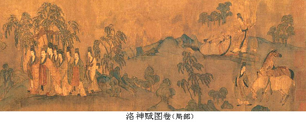 《洛神赋图》,取材于曹植名篇《洛神赋》。传世摹本共有五本,以故宫博物馆所藏北宋摹本最近六朝的古朴风格。曹植此赋借人神殊途,终难成眷属一事,陈叙失恋之哀音,隐托政治上失意的悲恸。画亦领会原赋情思,以情节的次递展开,把人、神均置于山水环境之中,通过画面人物相互关系以及景物的烘托,巧妙地表现了一种情意绵绵、若往若还、因人神相隔而惆怅不已的精神氛围和动人意境。譬如赋中描写宓妃“翩若惊鸿,婉若游龙。荣曜秋菊,华茂春松。”画面则以惊鸿、游龙、春松、秋菊等景物暗喻出来,别有一份神秘瑰丽、缠绵悱恻之思。 《女史箴图》取材于西晋张华《女史箴》。张华此作列举妇德故事,有规范妇人德仪之意,《女史箴图》虽取材于此,然其作意只是“晋尚故实”时代风气下的产物,未必有托讽之意。画中以一组仪态典雅、长裙曳地的妇女形象,真实地反映了贵族妇女的某些生活情景;人物造型古拙雅致,线条连绵舒缓,颇得“春蚕吐丝”之妙。