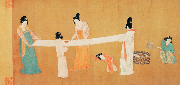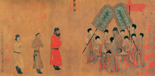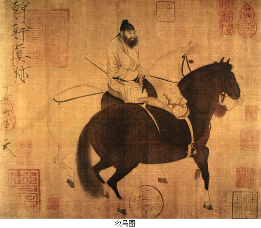 中国经过近四百年的分崩动乱,终于重新统一,是为隋唐两代。隋祚虽短,然国计富足,亦颇可观。但由于隋炀帝骄奢淫逸,穷兵黩武,隋很快覆亡。 李唐肇建,常以隋代覆灭为鉴,不敢骄纵荒佚,遂成治世。贞观之治、开元盛世每为史家称叹。然盛唐的命运,在于当时各项新制度的创建,待承平日久,各项新制度日趋崩溃,则盛唐之盛亦不可久保。唐玄宗晚年的骄奢淫逸,终于酿成安史之乱。此后,国势有江河日下之慨,内有藩镇割据、朋党相争、宦官专权之忧,外有回纥、党项、吐蕃侵扰之患,唐政府在此黑暗与混乱状态下又苦苦支撑了百余年,终于倾覆于流寇之手。 唐代二百八十九年,一般分成四个阶段:自开国至睿宗先天(618~712年)为初唐,自玄宗开元至代宗永泰(713~765年)为盛唐,自代宗大历至宪宗元和(766~820年)为中唐,自穆宗长庆至唐亡(821~907年)为晚唐。 经过南北朝民族大迁徙之后的隋唐文化已不是纯粹的华夏传统文化,而是在原有文化基础上,融合了许多民族和外国文化的新型文化,具有自由奔放、豪迈壮丽的时代特征,这种文化的形成与隋唐社会的开放风气密切相关。 有唐一代对儒、释、道三教并不偏废,均采取宽容态度。朝野上下,都体现出三教融合的思想趋势。唐代人对佛教仍保持着狂热的宗教热忱。南北朝发展起来的佛教文化,到了隋唐时期已成为中国传统文化的组成部分。佛教对唐代绘画艺术有着显著的影响。 【人物画】 隋与初唐绘画仍以鬼神人物题材为主,隋代杨契丹、郑法士、董伯仁、展子虔、孙尚子等皆擅长于此。在画法上,他们还保持细致丰丽的作风。初唐人物画家以阎立本、尉迟乙僧最为著名。