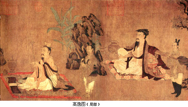 《簪花仕女图》描绘了贵妇于庭园中悠然闲度的生活场景。画中人物体态丰肥,绮罗纤缕,隐见肌肤,有温润香软之感。而华丽时髦的衣饰、故作娇憨的神态和雍容闲静的表情,似又暗喻了人物内心的寂寞与空虚。 周昉还长于佛教绘画,妙创“水月观音”样式。其佛教画成为一种流行样式,称作“周家样”。“周家样”与其以前张僧繇所创的“张家样”、曹仲达所创的“曹家样”以及吴道子所创的“吴家样”一并被奉为佛教艺术的典范。 唐末还有一位著名人物画家孙位,生卒年不详,会稽(今绍兴)人。他随唐僖宗避黄巢之乱入蜀,此后一直居成都。传世作品《高逸图》为《竹林七贤》的残存部分,画四文人列坐于花毡上,各有童子侍候。人物衣纹笔法圆劲,既继承了六朝以来的传统,又趋于工巧;湖石皴染周密,提供了唐末石法的实物资料。