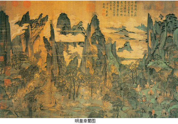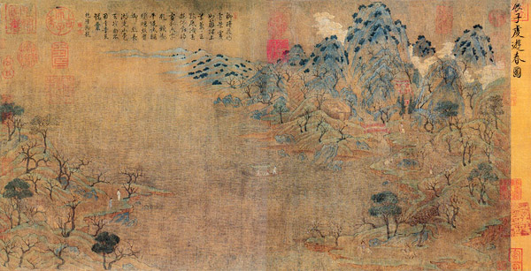 【山水画家及作品】 隋与初唐时期,描绘楼台宫观是当时的风尚。山石树木作为楼台宫观的配景,相应受到重视。当时擅长人物的画家,大多擅长此道。其中展子虔因有作品《游春图》传世尤值一提。 展子虔(550~604年),渤海(今山东阳信)人,历北齐、北周入隋。《游春图》是现存年代最早的山水卷轴画,画贵族游春情景。先用墨线勾勒,然后重着青绿,山脚处饰以金粉,金碧辉煌。在构图上则予人以“远近山川,咫尺千里”之感。