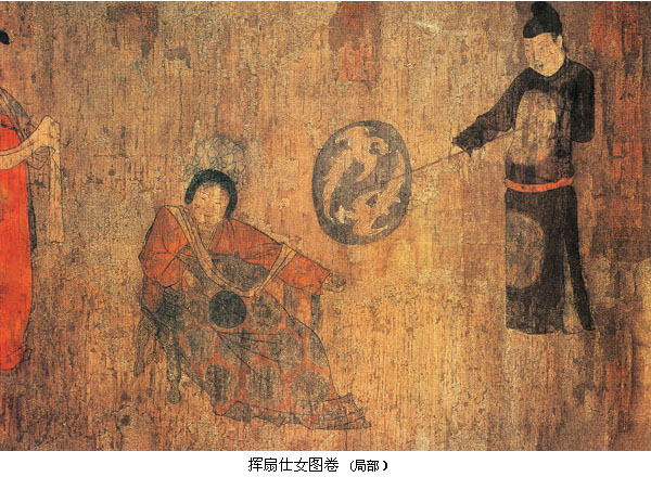 《挥扇仕女图》通过几组人物的活动,刻划了宫廷生活的某些片断。画中人物或悠然挥扇,或倚桐沉思,或忧怨对语,或闲散梳妆;人物肌体丰满,衣着华贵富丽,但流露出一种郁闷寂寥、百无聊赖的情绪。