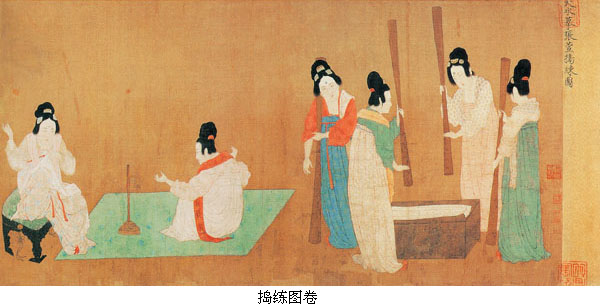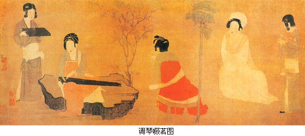 通过考察初盛时期的墓室壁画,大致可看出唐代仕女画的发展脉胳。初唐的仕女形面部丰满而体态修长,发展到盛唐的张萱,人物体态渐趋丰厚壮健了。 周昉,字仲朗,京兆人,生卒年不详,活动于晚唐时期。仕女画学张萱而青出于蓝。史载周昉画仕女“衣裳简劲,彩色柔丽”,体态浓丽丰肥,“颇极风姿”。他又长于画肖像,能得被画者“性情言笑之姿”。传世作品有《挥扇仕女图卷》、《簪花仕女图》、《调琴啜茗图》(宋摹本)等,虽真伪难以遽定,但仍可视为考察晚唐人物画发展状况的依据。