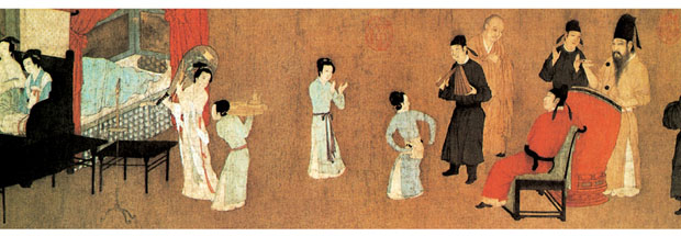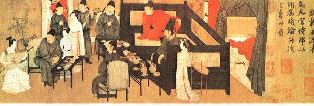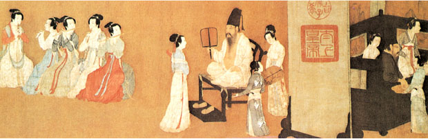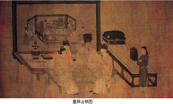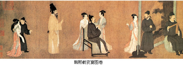 另有一件《琉璃堂人物画图卷》,原题“韩文苑图”,但画风不类唐画,与一件流失海外的摹自周文矩的同名作品构图极相似,且笔法行笔劲瘦有力,与画史记周文矩“衣纹作战笔,行笔瘦硬成挚”完全符合,所以应属周文矩作品。 顾闳中,生卒年不详,为南唐画院待诏。《韩熙载夜宴图卷》是他传世唯一作品,画南唐大臣韩熙载夜间在家中饮宴听声乐观舞伎的场面。据载李后主欲以韩熙载为相,然韩熙载不欲为亡国之相,故纵情声色以自诲,李后主为警诫韩熙载,乃令顾闳中夜至韩宅,目识心记而画此图。 画分五段,“听乐”、“观舞”、“歇息”、“清吹”、“散宴”,用屏风床榻分隔,构图巧妙,人物刻划细腻传神,于主人公韩熙载超脱不羁而又郁郁寡欢的复杂内心,尤为体察入微。如“观舞”一段,画韩熙载亲自击鼓配乐,名伎王屋山跳“六么”舞,可见出作者刻划人物复杂内心世界的深厚功力,主人公纵情声色但又无法解脱内心烦恼的精神状态跃然纸上。