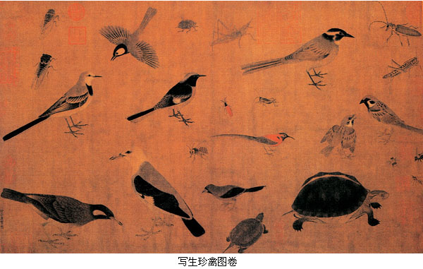 【花鸟画】 五代花鸟画家名家辈出,代表画家有黄荃、徐熙。 黄荃,生卒年不详。为西蜀画院画家。他曾于蜀宫壁上画四时花竹兔雉鸟雀,鹰“误认殿上画雉为真,掣臂数四,蜀主叹异久之”(黄休复《益州名画录》)。蜀主以至于命翰林学士欧阳炯作《壁画奇异记》记此事。黄筌多写蜀宫御苑中的奇花异鸟。极为工整细致、富丽堂皇。其子黄居寀承父业,亦善花鸟。北宋年间的画院画家多以黄氏父子艳丽、细巧、富贵的画风为尚。 黄荃的传世真迹《珍禽图》,为付子黄居宝临摹的课徒稿本,设色画虫鸟和大小龟二只,线描极细,有的地方为晕染的色墨笼罩,与画史所称“诸黄画花妙在傅色,用笔极新细,殆不见墨迹,但以轻色染成”可相映证。
