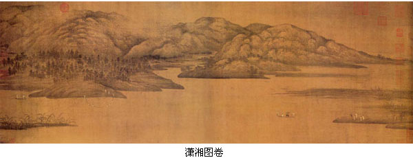表现江南山水的画法也于此期开始成熟。但入宋以后,这种画风并不受当时决定绘画风尚的北方贵族文人所欣赏。宋人对这种画风的代表人物董源、巨然记载甚为简略。 董源,生卒年不详。字叔达,钟陵(今南昌)人。于南唐任职“后苑副使”。人称董北苑。据成书于北宋时的《图画见闻志》、《宣和画谱》等书所载,董源本善人物画,而山水则有青绿和水墨二体。 北宋初年,董源的作品尚未为世所重。直到北宋中叶沈括《梦溪笔谈》才给以注意,称其“多作江南平远风景,不为奇峭之笔”,又称其“用笔甚草草,近视之几不类物象,远视则景物粲然,幽情远思,如睹异境”。米芾对董源的宣扬更为著力。在《画史》中称其画“平淡天真”,“峰峦出没,云雾显晦,不装巧趣,皆得天真……溪桥、渔浦、洲渚掩映,一片江南也。”不过,沈、米二人的宣扬显然并未引起广泛重视,因为接下来的南宋时期,董源依旧寂寂无闻。 董源在沉寂近三百年后,到了元代突然声名鹊起。有元一代师学董源画法的画家很多,这又成为另一次山水画变革的诱因之一。到了明末董其昌倡“南北宗”说,董源更被捧为南宗的实际创始人。元代人的选择代表了一种不同于宋代人的绘画欣赏趣味,而他们并未试图反映出董源绘画的全貌。因此,今天所看到的董源的作品是被一批具有很强的文化与政治动机的后世画家所过滤和筛选过的。极有可能的是,今天所知的只是被元代和明末文人画家塑造出来的董源的形象。 传为董源的作品大致有两种画法:一是作淡设色点子皴,点簇丛树,如《潇湘图卷》画山树墨色清淡,草草点簇,皴染浑厚,江山平远。属于此类画法的尚有《夏景山口待渡图卷》、《重林寒汀图卷》、《夏山图卷》等。另一画法为作长披麻皴,高树枝干浑厚,或双钩夹叶,或大青色渲染,如《溪山行旅图卷》和《龙宿郊民图卷》。