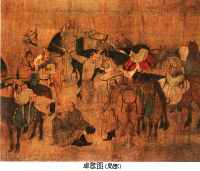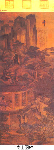 上述作品所画山形,多为江南一带的丘陵,大都为坡陀起伏,土山戴石,少有陡峭挺拔之状。这与荆浩、关仝所表现的气势雄伟的北方山水正好形成鲜明对比,而且也符合沈括、米芾的评价。但《宣和画谱》又称“大抵元(即董源)所画山水,下笔雄伟,有崭绝峥嵘之势,重峦绝壁,使人观而壮之”,则董源画山水可能另有雄伟一格。 置于董源名下的作品尚有《溪岸图轴》,真伪虽有争论,但大致可定为一件五代与北宋初之间的作品。 董源所创造的水墨山水画新体格,当时得到释巨然的追随,后世遂以“董巨”并称。 释巨然,生卒年不详。江宁(今南京)人。师董源,入宋后居汴梁。画史上称“善为轻岚气象,山川高旷之景,但林木非其所长”(郭若虚《图画见闻志》)。传世作品中以《秋山问道图轴》最体现其面貌,此画绢本水墨,用长披皴,山林高深,草木华滋,清淡秀润。但有学者认为画中程式化的披麻皴和苔点,是元代才发展出的,因此该图只能是元代的作品。至于传为巨然的另外几件作品《万壑松风图轴》、《层崖丛树图轴》、《谿山林渚图轴》等,其真伪也是见仁见智。 与其师董源一样,巨然在画史上的影响,要等到崇尚抒情写意的元代才表现出来。 除荆、关、董、巨等大家外,五代山水画家尚有赵幹、卫贤、郭忠恕等人。 赵幹,生卒年不详,江宁(今南京)人,南唐画院学生。《江行初雪图卷》是他传世唯一作品。此图有北宋李邦直题跋“病骨未为山下土,尚寻遗墨话兴亡”句,因而是五代山水画家流传作品中最可征信者。画中林木用笔,黄芦及水纹用笔尖细流利,天空用粉弹作小雪,生动表现了初冬时节的江南渔村雪景。 卫贤,生卒年不详,本长安人,后任南唐内供奉。擅画界画。传世作品有《高士图轴》,画东汉梁鸿、孟光“举案齐眉”故事。画中林木劲挺,山峦浑厚,显是结合了江南与北方山水体格的画法。 郭忠恕(?~977年),字恕先,河南洛阳人。他长于界画,其画以准确、精细著称。存世作品甚少,较为可信者仅《雪霁江行图》一幅,画江上停泊两艘大船,精细绝伦。 人物画 五代十国承晚唐余绪,人物、宗教画仍有相当规模。 北方则有后梁赵嵒的人马,张图、跋异、胡翼、王殷、郑唐卿等的道释人物;后唐契丹族李赞华(原名突欲)、胡瑰的北方人物鞍马均负盛名。 西蜀则有前蜀释贯休的罗汉,高道兴、房从真、杜子瑰的佛像人马鬼神;后蜀赵德玄父子、蒲师训父子、阮知诲父子、丘文播兄弟父子的佛像人物鬼神牛马,张玖的传神写貌,均有相当成就。 前后蜀画家还创作了大量现实生活中的人物写生。当时成都的上层人物,几乎都在寺院道观壁画中留下形象,希冀以此得到神灵保佑。 南唐曹仲玄的佛道鬼神、周文矩的贵游人物仕女,顾闳中的人物,陆晃的村野人物道像星辰,王齐翰、顾德谦的道释人物,卫贤的楼观殿宇盘车水磨,均极一时之盛。 上述诸人的道释人物肖像鞍马等作品,惜大多不存;有作品传世的,以胡瑰、周文矩、顾闳中三人最足称道。 胡瑰,后唐时契丹人,或谓范阳(今河北涿州)人。擅画番马,能曲尽塞外之趣。现存作品有《卓歇图卷》,画契丹族于草原上搭立帐幕休息的情景。其中席地盘坐,举杯而饮的首领形象,动作神态颇得神韵。 周文矩,生卒年不详,建康(今南京)人。为南唐画院待诏。善画人物,仕女学周昉,衣纹作“战”(即颤动之意)笔,以此为别。传世作品有《重屏会棋图卷》,画南唐中主奕棋之状,人物身后是一屏风,屏风画中复有一屏风,故称“重屏”。另有《宫中图卷》(宋摹本)画宫女八十余人,反映宫女生活的各个方面,形像生动,饶有思致。