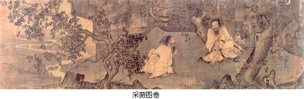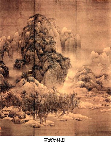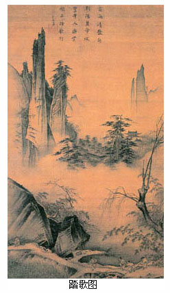 徽宗画院的成就可从北宋末年两件传世杰作见出,即王希孟的青绿山水作品《千里江山图》和张择端的风俗画长卷《清明上河图》。 王希孟,徽宗时画学生。完成《千里江山图》时,年仅十八岁。五代以后,水墨写实性山水兴盛,青绿山水渐失其主流地位。《千里江山图》说明了青绿山水传统在宋代的复兴,它运用青绿山水赋彩方法和宋代全景式山水的视觉构图原则,画崇山峻岭、江天浩渺之景,其中点缀屋宇寺观,桥梁舟船,风格典雅壮观,气势磅礴开阔,而又亲近自然,显是结合了唐代和北宋这两个伟大的山水画传统才能取得的成就。 张择端,生卒年不详,字正道,东武(今山东诸城)人。善画市桥城郭,舟船盘车。《清明上河图》画汴京当日繁盛热闹的城乡、街市、水道情景。起段长河两岸,新柳成行,一行骡队正匆匆走来。继而行人渐多,车舟渐密,又有野店酒家掩映于绿树丛中。继而舢艇相接,临河酒楼茶肆栉次鳞比;圆拱桥上摩肩接踵,桥下一舟撑过,人声嘈杂;而岸边则有人悠闲散步,于热闹繁华景象中,衬以闲适意趣。进城以后,房舍更为繁密,人物也更复杂,各色人等,如活如现。总计全图画人550余人,马、牛、骡、骆驼等各种牲畜60余匹,车、桥约20余架,船大小共20余艘,房屋30余栋。它不仅是中国绘画史上的杰构,也是研究宋史的珍贵图像文献。《清明上河图》以其喧闹的画面吸引了无数追忆北宋东京盛世景象的后世文人,素为世所珍爱。 南宋初期的绘画 南宋早期包括高宗至孝宗两朝(1127~1189年)。南渡以后,画院制度重新恢复,大批画家南下,薈萃画院,画院进入鼎盛时期,形成具有独特风格的院体绘画。 南宋院画最重要的成就是山水画。南宋山水较之前代,最主要变化体现在将五代以来全景式山水格局演变成一种更加自然化和生活化的边景山水,笔墨表现上更加突出墨法简练苍劲的表现能力。这种由繁入简、由整体到局部、由宏大内容到诗意小品的变化反映了一种新的自然观察方式和美学趣味的出现。它甚至直接启迪了后世文人山水画风,虽然后世文人对南宋剑拔弩张、水墨苍劲的画法并不欣赏。 南宋山水画的这一变化始于李唐。李唐,生卒年不详。字晞古,河阳人。北宋徽宗年间入画院,南渡后复为画院待诏,年已近八十。《万壑松风图轴》为南渡前作品,仍保留了五代北宋全景山水的气象,但苍劲有力的用笔和富有质感的墨色则已显示出即将到来的南宋山水的风貌。如果说《万壑松风图》是北宋山水向南宋山水的一种过渡,那么李唐的另一传世山水作品《清溪渔隐图》可谓是典型的南宋式边景山水。画中山水景致有明显剪裁痕迹,坡岸窠石以水墨淋漓、笔势苍劲的大斧劈出之,树木、茅屋、水车、小桥则简洁爽劲而生动有趣。雄伟险峻的北宋山水至此已演变成清朗雅致的小桥流水,《清溪渔隐图》显然已开南宋中后期边景山水的先声。 李唐还长于人物画。《采薇图》应为南渡后作品,画殷代遗民伯夷、叔齐兄弟不食周粟,饿死于首阳山事。人物形象生动传神,衣纹简洁潇洒;树石笔法粗简苍润,已是南宋山水画风。