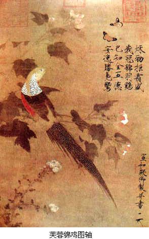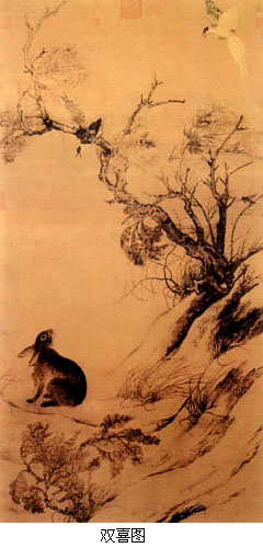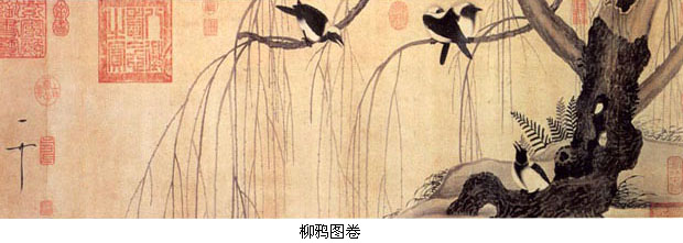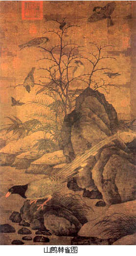 宋代中期文人艺术趣味的重要变化也影响了同期的花鸟画创作。由重彩勾勒的富贵型花鸟画向水墨写意型花卉的转变直接发生在宋代画院,而发动这场院内花鸟画变法运动者是崔白。 崔白,生卒年不详。字子西,濠梁(今属安徽)人。崔白的花鸟虽也来自写生并仍保留了黄家花鸟的部分体格,但他吸收了徐熙画法中野逸画风,将黄家花鸟富丽而略显板滞的体格发展成为一种清澹疏朗、形神兼备的水墨风格,完成了宋代画院花鸟画的一次重要变革。崔白的《双喜图》、《寒雀图》代表了这一变革的成就。尽管技法上仍有黄家写生画法痕迹,但少了富丽的色彩而显得活泼自然,树枝纯以水墨出之,清致而有骨气,工笔与写意画法达到了高度和谐的境地。 北宋中期画院还出现了以没骨写生花卉著称的赵昌和以善画猿猴獐鹿等野生动物著称的易元吉。他们都表明宋代画院在文人画风尚影响下所发生的一些趣味和视觉方式上的变化。 赵昌,生卒年不详,字昌之,广汉(今属四川)人,作折枝花鸟极有生意,有“写生逼真,时未有共比”之誉,并有“写生赵昌”之称。传世作品《写生蛱蝶图卷》(鉴定专家多否认之)画郊野花草,蝴蝶翩然起舞。花草皆作双钩,用笔有轻重顿挫,设色雅淡,风格清新俊逸,为宋代花鸟画中的经典之作。 易元吉,生卒年不详,字庆之,湖南长沙人。为了追求表现野生动物的野逸之姿和动静之态,他曾深入山泽林薮中去观察动物的活动。又于家中建造池沼,养蓄各种水禽,暗中进行观察。故其作品极其自然生动。传世作品仅得《聚猿图》一卷,画山石清泉岩洞间,神态各异的群猿嬉戏之状。 北宋晚期的绘画 北宋晚期时间范围是徽宗、钦宗两朝(1101~1127年)。 宋徽宗断送了北宋江山,却造就了中国画院史上一段辉煌的历史,这对中国传统儒学中“依仁游艺”思想实在是莫大讽刺。 宋代开国即仿五代西蜀、南唐旧制建立翰林图画院,但在徽宗之前,其基本职能是为国家工程招摹和组织画工,以及搜访鉴别法书名画。徽宗时对之优渥眷顾,提高了院画家的政治地位和经济待遇,画家以入院为荣,把入院作为进身之阶。至宣和年间(1119~1126年)画院一时为盛。徽宗于画院之外,还别立画学。 画院与画学虽同为研治画艺的场所,但并非一物。从设立时间看,有宋一代,画院一直存在。而画学只存在于徽宗崇宁至宣和之间,前后合计不过二十年。从两者建制、设官、职掌看,画院是以一种专门技艺供奉主上的内侍衙门,与翰林书艺局、翰林太医院并列,隶属于内侍省翰林院。画学之兴,乃是因为徽宗憾画工才艺不称旨,于是兴画学以教育画工,出题取士如进士科,立博士以下学考其艺能。可见画学实为纳入当时国家教育及考试制度中的专门学校与考场,与当时书学、算学、律学、医学等诸学并列。 徽宗极重画家的综合素质,常以唐诗为题考核画学考生。要求考生既有紥实的写实功力,又要传达出诗的意韵。画学诵习与考试的学科,于经义方面,分别士流、杂流,士流须兼习一大经,或一小经,杂流则诵小经或读律。此外还以《说文解字》、《尔雅》、《方言》、《释名》四书设问答,用以从学识修养考其所业。 宋徽宗赵佶(1082~1135年)本人具有很高的艺术造诣,他常亲临画院,指导和参予创作。据《画继》记载,他曾指出院画家画孔雀升高先举右脚的错误:“孔雀升高,必先举左”。此事亦可见出宋人对客观事物周密观察和真实表达的作风。现存传为徽宗的作品著名的有《听琴图》、《芙蓉锦鸡图》、《柳鸦图》、《雪工归棹图》、《瑞鹤图》等,题材涉及人物、山水、花鸟、界画,风格又有工细富丽和简朴清雅两种,至于是否全为徽宗亲笔,则众说不一。