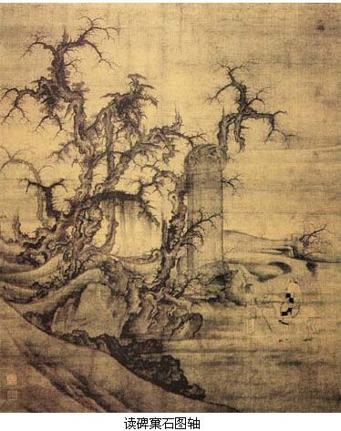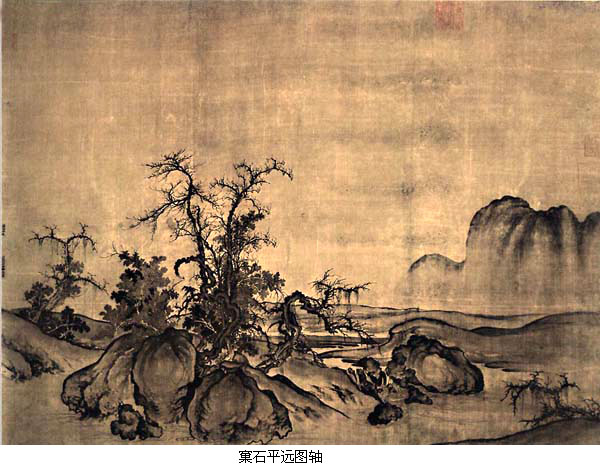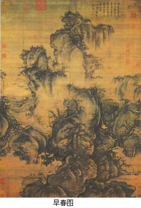 郭熙,生卒年不详,活动时间,约为熙宁、元丰(1068~1085)间。河南温县人。曾为御画院艺学。师学李成并将李成的画石法发展为卷云皴,即把皴法与墨染融为一种笔法,层层复加,造成一种滋润而模糊的艺术效果。 郭熙对北宋山水画发展具有许多独创性贡献,如明确划分出三种布境方法:高远、平远和深远,从而肯定了人们对山水视觉观察和感悟的多样性,丰富了山水画的视觉表现力;开始将山水画的视觉表现从仅仅刻划自然质地推进到表现山水在不同季节、不同时辰的变化。《早春图》这件描绘北方早春清晨山色的全景式作品,完整运用了郭熙的“三远”构图,它最为后世称道处是传达出了早春时节的特殊景致和意象。《窠石平远图轴》,水墨写深秋清旷之景。远峦一抹,轻笼暮蔼,体格近似李成的平远寒林山水,但更突出秋野的清旷和苍茫,笔墨也更简练圆。