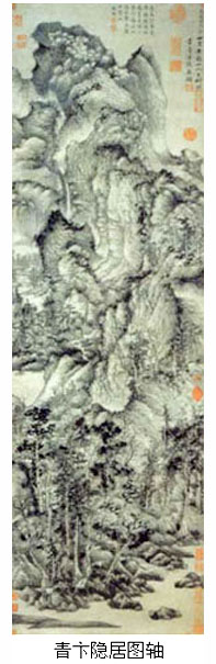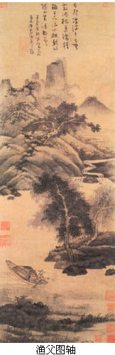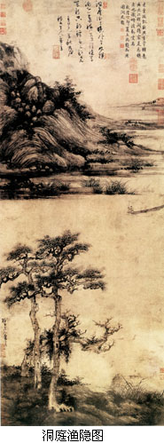黄公望的山水画又有浅绛山水一体,在画上笼罩淡赭色,增加画面的整体感,也使墨色更加滋润,有《九峰雪霁图》、《快雪时晴图》等传世作品。黄公望在后世被誉为“元四家之冠”,在清代甚至形成“家家一峰,人人大痴”的局面。 吴镇(1280~1354年),字仲圭,号梅花道人,浙江嘉兴人。以卖卜为生,一生穷困潦倒,其人生前不名于世,连画也被讥为“有酸馅味”,直到明代,方渐为人们所重视。