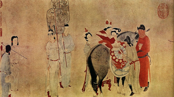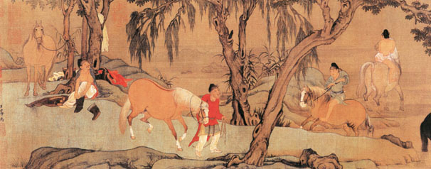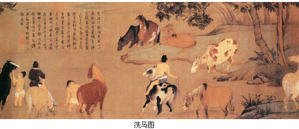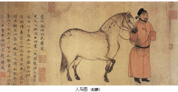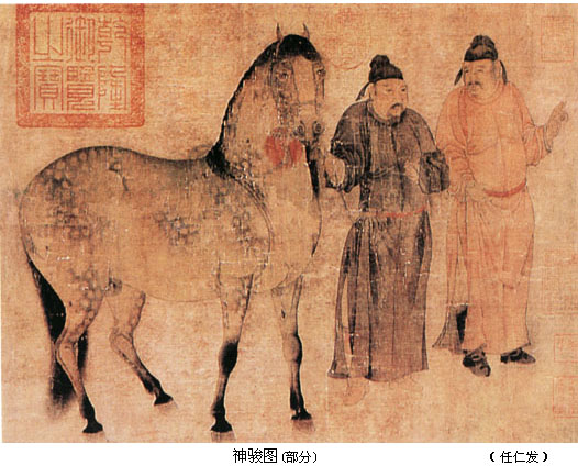 王振鹏,字朋梅,号孤云处士,永嘉(今浙江温州)人,师法李公麟,笔法流畅劲健,人物神情生动,传世作品有《伯牙鼓琴图》。而且精于界画,自成一体,《金明池龙舟图》传为他的作品。 任仁发,字子明,号月山,松江上海人,鞍马画与赵孟頫齐名,“用笔逼龙眠(李公麟号)”,“法备而神完”,传世作品有《二骏图》、《五马图》等。