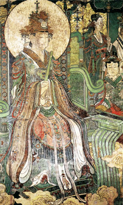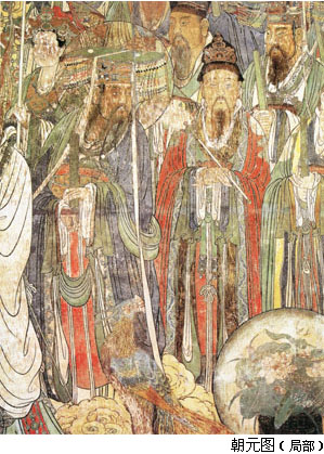 【壁画】 元朝政府为了利用宗教维护其统治,采取保护宗教的政策,大肆营建佛寺和道观,佛寺、道观壁画亦应运而生。现存甘肃敦煌莫高窟第3窟和第465窟佛教密宗壁画,山西稷山兴化寺、青龙寺佛教壁画,山西芮城永乐宫、洪洞广胜寺水神庙道教壁画等。尤其是芮城永乐宫三清殿壁画,最为闻名。 永乐宫故址在山西永济县,1959年原样迁至芮城县。壁画内容为道府诸神朝谒元始天尊,故名《朝元图》,共绘画像394身,由洛阳马君祥等民间画工绘制。主像高达3米以上,神态闲雅,雍容华贵;群像大多2米有余,上下排列四、五层之多,相互交错,井然有序,性格鲜明,各具神态。画法为重彩勾勒,线条为铁线描,劲健婉转,人物须眉根根见肉,衣纹流畅奔放,充分发挥了线条的表现力。规模宏大,人物众多,内容丰富,技艺精湛,堪称元代寺观壁画中的最佳作品。