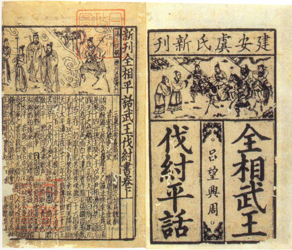 元代是杂剧兴盛时期,在墓室壁画中也出现了当时杂剧场面的描绘。如山西洪洞水神庙的《杂剧图》,表现了杂剧演出的盛大场面。元杂剧演员中不少为女性,元人夏庭芝《青楼集》所记女演员达百余人,山西运城元晚期墓壁画中绘有女子扮演的旦角,反映了这一事实。此外,山西新绛元墓杂剧砖雕、山西永乐宫潘德冲墓石棺杂剧线刻人物也反映了元代杂剧场面。 【版画】 中国版画历史悠久。敦煌石室发现的唐咸通九年(868年)刻印的《金刚经》扉页画《说法图》,是现存最早有确切年代可考的版画作品。早期的版画,以佛经插图为主。宋金时期,随着印刷术的进步和出版业的兴盛,版画的运用范围日渐扩大,出现了最早的花卉图谱《梅花喜神谱》和带有年画性质的招贴画《四美图》等。 元代的版画,在以往基础上有了很大发展。北方的大都、平阳(今山西临汾)和南方的杭州、福建建阳是当时刻书业的中心,也是版画艺术的中心。活字印刷术的广泛应用,为版画艺术的发展提供了必要的物质条件;杂剧、话本等市民文学的兴起,则为版画创作注入了新的活力。元代版画呈现出书籍插图、画谱和宗教雕版全面发展的态势。 《全相平话五种》是现存最早的讲史类话本,题署“建安虞氏新刊”,成书于至治年间(1321~1323年),撰书者不详,刻工有吴俊甫、黄叔安等。此书插图为上图下文、双面连式,每图有标题,线条明快,人物形象简练而有生气,是元代版画插图的优秀代表作品,并对后世小说、戏曲插图有深远影响。