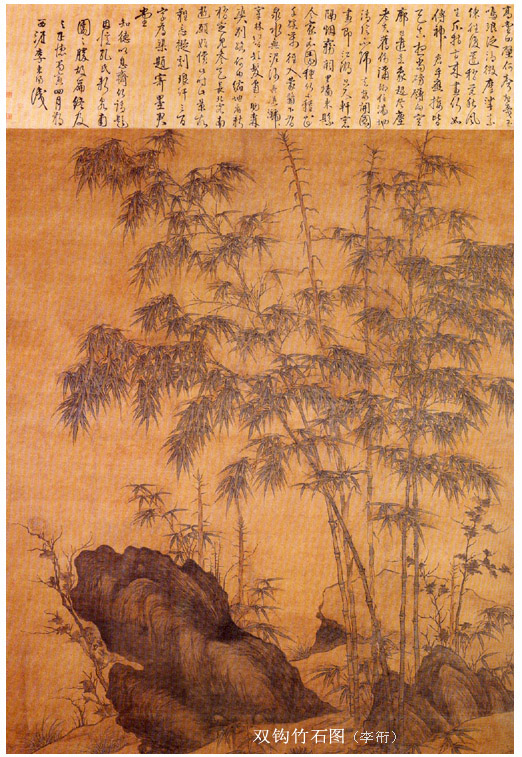 王渊,字若水,号澹轩,钱塘(今浙江杭州)人,生卒年不详,主要活动于元代后期。年幼时曾得到赵孟頫指点,山水、人物、花鸟无一不精,尤擅长于花鸟。师法黄荃,又取扬无咎、赵孟坚等文人水墨画法之长,突破南宋院画工丽纤巧的成规,创造出一种运用墨色的浓淡干湿变化而略带写意表现物象的新风格,对后世影响极大。传世作品有《山桃锦鸡图》、《牡丹图》、《竹石集禽图》等。 柯九思(1290年~1343年),字敬仲,号丹丘生,台州仙居(今属浙江)人。文宗朝曾任奎章阁学士院鉴书博士,审阅鉴定内府所藏古代法书名画,又曾为宫廷作画,深受文宗宠眷。擅长画竹,师法文同,而能自出新意。画竹有时以浓墨为面,淡墨为背,分其阴阳向背。又善于以书法的用笔画竹,自称以篆法写竹干,草法写竹枝,八分法或用颜真卿的撇笔法写竹叶。传世作品有《双竹图》。 王冕(1287年~1359年),字元章,号煮石山农,梅花屋主等,会稽(今浙江绍兴)人。以画梅著称,在画梅技巧上亦颇有创造,首创“以胭脂作没骨体”,而且突破前代画梅大多疏枝浅蕊的成法,改之以繁花茂枝,别开生面,对后世写意花鸟画影响颇大。亦工诗,故宫博物院藏《墨梅图》自题“我家洗砚池头树,个个花开淡墨痕,不要人夸好颜色,只留清气满乾坤。”表露了他不愿追逐名利,甘于淡泊的高尚情操。 【人物画】 元代人物画,虽远不如山水、花鸟兴盛,较之前代,更显式微,但亦不乏名家。元初赵孟頫、钱选皆擅长人物画。此外,尚有刘贯道、王振鹏、任仁发、张渥等人物画家。 刘贯道,字仲贤,中山(今河北定州)人,师法晋唐,笔法凝重,人物生动传神,传世作品有《元世祖出猎图》、《消夏图》。