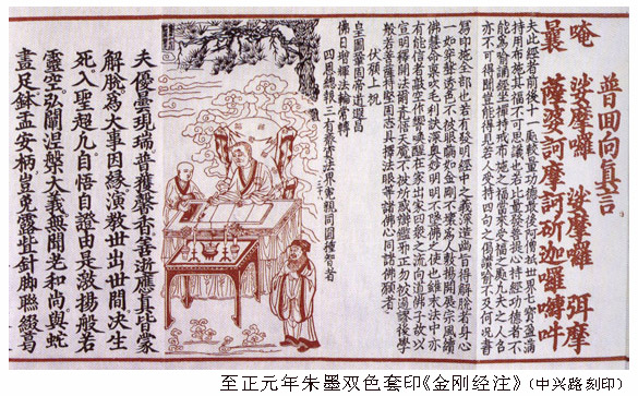 画谱方面有画竹名家李衎编绘的《息斋竹谱》,绘于大德三年(1299年),刻于延祐末年。《竹谱》不仅是中国古代论画竹的名著,在版画史上也有十分重要的地位。 元代官方和民间都刻有大量佛经。佛经插图继承了唐宋版画的传统,显示出高超的雕版技巧,如至元元年刊《金刚经注》版画,采用了朱墨套印技术,为现存较早的套色版画作品。