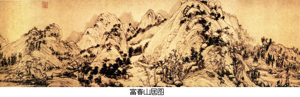 钱选山水师学北宋赵伯驹,又能自出新意,用笔质朴稚拙,格调清新脱俗。其传世作品《山居图》尽去传统青绿山水画精工富丽的习气,别具一种清丽秀雅的新风格。花鸟早期师学两宋院体作风,晚年别开生面,由精工细密变为豪放简逸,传世作品《白莲图》水墨淡设色,开创了水墨写意花鸟的先声。其人物画亦有作品传世,如《柴桑翁像》,画东晋诗人陶渊明策杖行吟的情景,人物衣纹作高古游丝描,笔法细劲,设色淡雅,为其人物画中的杰作。 钱选与赵孟頫同为“师古”的倡导者,主张画须有“士气”,要能体现出文人的气质。这一艺术主张对后世影响极其深远。 高克恭(1239~1310年),字彦敬,号房山,回族人,大都(今北京)人,官至刑部尚书。他曾于江南任职多年,饱览江南的名川大山,又广泛结交江南文人,这都在一定程度上影响了他的画风。 高克恭擅长山水,融合米氏云山兼取董巨披麻皴而自成一家,时有“南赵(孟頫)北高”之称。其传世作品《云横秀岭》,云烟蒸腾,山麓坡谷,丛林茂密,清溪涓流,笔墨凝重浑厚,意境清旷幽远。此外尚有《春山欲雨》、《竹石》等传世作品。 黄公望(1269~1354年),字子久,号一峰、大痴道人等,江苏常熟人。他曾为小吏,因事入狱,获释后入全真教,往来杭州、松江等地以卖卜为生。他是元季四家中唯一得与赵孟頫交游的人,自称“松雪斋中小学生”。 黄公望山水师法董巨,能变其法,自成一家。他擅长写生,每逢出游,必携纸笔,心追手摹。其晚年作品《富春山居图卷》长达两丈,状写富春江两岸初秋景色,前后历经三四年的惨淡经营,始告完成。画中峰峦平坡,丛林密树,起伏变化无穷;水村山庄,渔舟芦荻,层出不尽,涉笔成趣,全图笔墨苍茫,意境高逸,为黄氏平生最为得意之作,素有“画中兰亭”之称。 《富春山居图卷》中山石树木的表现特色是,简化了传世董源作品中披麻皴笔法组织的规则性,真正实现了“用笔甚草草”,更为真实地表现出江南丘陵土山戴石的形体特点。同是描绘江南山水,黄公望的观察较之董源更为细致复杂,更少概念性,因而在表现上更为凝练、丰富,更符合人的视觉感受。此图反映了元代画家对视觉的客观感受的高度重视。画中虚景与实景之间由于微妙的墨色渲染而贯通一气,天地之间虽然悠远寥廓,却是一个有机的整体。画中空白之处也真正成为具有实感的空间,这种代表“气”的空白不再是作为山水的装饰,也不是作为什么象征而存在,而是让它按自然中的原有状态浸染万物,令人产生一种亲和感。《富春山居图卷》历经辗转流传,至明末为吴洪裕所得。吴氏宝爱异常,坐卧不离,达数十年之久。吴临终弥留之际,竟以画投火相殉,幸得其侄抢救及时,大体完好。此后画分为二,灼焦的一卷,称“剩山图”,余下完好一卷,称“无用师卷”。