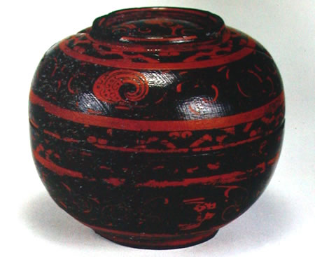 木胎,旋制。盖与器身以子母口扣合而成。盖顶微隆,有圈足状抓手。器身圜底,圈足。里髹红漆,外髹黑漆,并用红漆绘图案。盖、器身各饰三道条纹,盖顶、盖面及器身腹下饰变形鸟纹、卷云纹、圆点纹等,盖顶抓手、器底圈足周边及盖、器口沿均饰几何纹、圆点纹。
