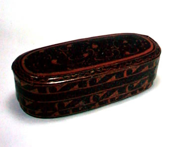盖与底为厚木胎,斫制;盖沿与器壁为薄木胎,卷制。整器椭圆形,由器身与盖相套合。直壁、平底,盖顶隆起。内髹红漆,外髹黑漆,并以红漆彩绘各种纹饰,盖顶中心为卷云纹、圆卷纹,外圈为波折纹、圆点纹,盖沿及器身外壁下部绘变形鸟纹。