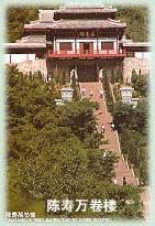 万卷楼为西晋著名史学家、《三国志》 作者陈寿青少年时代读书治学的地方。位于 南充市西山风景区。 万卷楼始建于三国蜀汉建兴年间(公元 222-237年)。据古书记载:南充城 西有果山,此处有万卷楼。它倚岩而建,为 三重檐式木石结构楼阁,飞檐斗拱,气势雄 伟。至唐代又在楼前建甘露寺,形成建筑群。 四周古木葱郁,翠竹蔽天,甘泉流淙,构成 一幅优美动人的山水画卷。因年久失修,于 二十世纪六十年代毁坏。 现存的万卷楼于 1990年由政府拨款400万元恢复修建, 它由陈寿读书楼、陈寿纪念堂、藏书楼组成, 倚山而立,气势恢宏,流光溢彩,建筑面积 2400平方米。中国书法家协会副主席、 中国佛教协会会长赵朴初亲笔题写的长4.7米,高1.8米的“万卷楼” 金字巨匾熠熠生辉。耸立在万卷楼庭院中央的高5米、重1吨的陈寿青铜 塑像形态逼真,手抱竹筒,神韵飞扬。纪念堂中陈列的《三国志》以及大 量的文字、图画、表格、照片、实物等资料,详细地介绍了陈寿坎坷经历、 著书史实及其对后世的影响。 四壁彩绘的十六幅以《三国志》史实为内容 的三国壁画,堪称国内一绝。南北廊轩中以《三国演义》故事为内容的仿 汉代拓片型的线刻壁画,以及各地书法名家为万卷楼创作的书画楹联,令 游客赞不绝口,有入三国之境。陈寿万卷楼陈列内容丰富,兼艺术性、历 史性和游览性为一体,对研究和弘扬三国文化,促进三国文化与世界民族 文化的交流具有积极的作用 。
