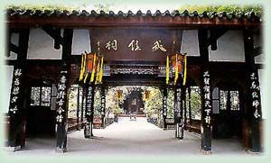 成都武侯祠是纪念诸葛亮名胜中最负盛名的一处。1961年列为全国重点文物保护单位。 诸葛亮(181年─234年),字孔明,今山东沂南人,是我国历史上卓越的政治家、军事家。三国时他任蜀国丞相,业绩斐然,死后受到追思,不少地方陆续修建祭祀他的祠庙——武侯祠。 成都武侯祠始建年代无资料可详考。从诗人杜甫的“丞相祠堂何处寻,锦官城外柏森森”的诗句推断,祠堂早在唐代以前就建成了,而且为繁茂的柏树所掩映。唐代的资料还说明,武侯祠与刘备墓和刘备庙毗邻。 明代初年,武侯祠被并入刘备庙。明代末年,祠庙毁于战火,清代康熙十一年(1672年)重建。重建时,以前后两大殿分祀刘备与诸葛亮,形成了君臣合庙的特有格局。 今天的武侯祠占地37000平方米,古柏苍翠红墙环绕。主体建筑坐北面南,摆在一条中轴线上,依次是大门、二门、刘备殿、过厅、诸葛亮殿五重,西侧是刘备陵园及其建筑。二门至刘备殿与东西廊,过厅至诸葛殿东西两厢房,形成两组四合建筑结构。轴线建筑两侧配有园林景点和附属建筑。