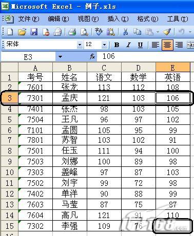 1、右键单击E3单元格(106分),左键单击“插入”,在打开的“插入”对话框中选择“活动单元格下移”,然后点“确定”,这时就会把E3单元格给空出来,而其原数据则被推到了E4单元格中……我们在其中直接输入孟庆的英语成绩109就行了。(如图2)