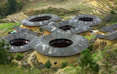 建筑巧合造就神奇 田螺坑地名的来历颇为蹊跷。有村民说,它得名于村庄背靠的湖岽山状似田螺;也有人说,田螺姑娘的神话故事说的就是黄家祖宗,那个叫黄百三郎的幸运儿,因为田螺姑娘的神助,才得以从一个养鸭少年成为一方富绅。 田螺姑娘未必是真,黄百三郎可是确有其人。田螺坑黄氏族谱证实,清朝嘉庆年间黄百三郎从永定移居此地,并在这里开始了他的传奇人生。土楼群中的黄氏祠堂中央有祖先牌位,黄百三郎名列第一,而他的墓穴就在距田螺坑二公里外的“五更寮”,每年清明都接受着田螺坑人的祭祀。 这个养鸭少年当年充分利用山涧泥地尽是田螺,以及谷深林密的地域优势,不断扩大再生产,为自己赚取了第一桶金。像大多数中国人一样,黄百三郎有钱之后最喜欢做的事就是盖房。最先盖起来的是方楼,也就是“那碗汤”,雅名“步云楼”。沿着高低地势将中厅修建成阶梯状,让人进入大门后就能体会“步步高升”的快感,这样既突出了祖厅的重要地位,又寄托了“平步青云”的美好愿望。这样智慧的男人田螺姑娘不喜欢才怪呢。 继“步云楼”建成之后,黄百三郎的后代又环绕着它先后建起了“和昌”、“振昌”、“瑞昌”和“瑞云”四座圆楼。现代建筑专家来考察后,都叹服古人的建筑智慧。这四座圆楼的建造者以顺地势增减一层屋柱高度的方法,成功地在第二层取得了平面,大大方便了居住。 在闽西南一带,建土楼的传统由来已久。比起砖石和木质结构,建造土楼的工序显然要烦琐许多。在大量生土中,要掺上石灰、细砂、糯米饭、红糖、竹片、木条等,并反复揉和、舂压、夯筑,建筑场面十分热烈,整个过程看起来不大像在盖房,倒像是在过节。 在聚族而居的土楼里,一层为厨房,二层为仓库,三至五层为起居室,院落里有水井,有宽阔的活动空间,其温馨和谐的场景想想都觉得美。客家人喜欢土楼,还因为它有防盗、防震、防兽、防火、防潮、冬暖夏凉等优异性能,外表土就土吧,在门面与实用无法兼顾时,当然实用更重要些。