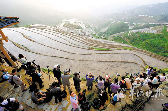 龙胜梯田属于水田,集壮美和秀美于一体,因远看线条精细,每当春季灌溉时,梯田犹如一面面银镜。春暖花开时,正是梯田摄影的最佳时节,来自国内外的摄影发烧友竞相来抓拍龙胜梯田的月云景观以及农夫春耕、牧童犊牛等美景。