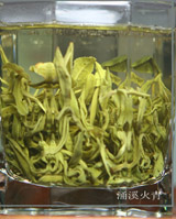 桃花潭涌溪火青系全国十大名茶之一,产于皖南泾县涌溪。产地青山环抱,云雾缭绕。此茶常年与山花为邻,白云作伴,故叶如碧玉、味似花香。采制工艺十八道,生产历史五百载。