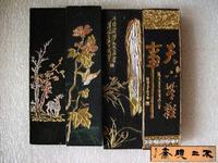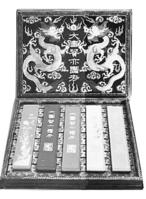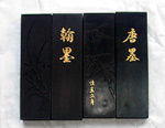 四是从用途上可分为观赏或收藏墨和实用墨。本县老胡开文墨厂生产的“十大仙”、“大、小魁星”、“寿星”、“古佛”、“罗汉图”、“西湖图”、“琴剑棋”、“鉴真东渡”、“金蝉”、“金龟”、“宝剑”及其它集锦墨都属于观赏收藏墨。实用墨基本上是零锭墨。名贵的实用墨亦可作观赏和收藏用。