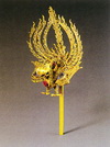 两种样式的步摇均为宋元所继承。陆城南宋墓出土的步摇,似乎遥承魏晋步摇的样式。北宋刘沉墓出土的步摇,包镶水晶的银片外缘悬系一溜小坠,出土时尚存一枚菱形残件。与它式样相同的还有四川阆中宋墓出土的一对金步摇。此式步摇的插戴,可见大阪市立美术馆藏宋人绘《送子天王图》。