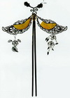 步摇在魏晋时相当流行,东晋顾恺之《女史箴图》也绘出了它的形象。图中步摇皆两件一套,垂直地插在发前,它的底部有基座,其上伸出弯曲的枝条,枝上似有金摇叶,恰与出土文物相符。这种步摇一直延续到南北朝时期,是六朝贵族妇女喜爱的头饰。