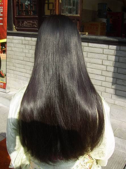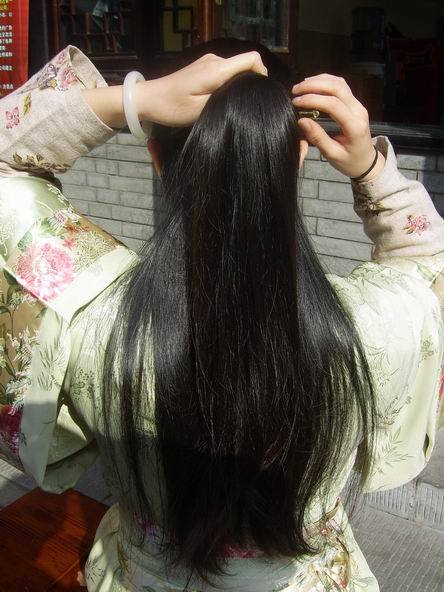 2、用手指从两只耳朵后面往上分头发,把头顶部约三分之一的头发握住,梳平滑后用黑色橡皮筋扎起来