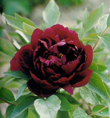 Reddish black with glistening,Rose-shaped;narrow leaves in dark green,flat round buds with black purple at base, erect flowers,half_spreading,later blooming.