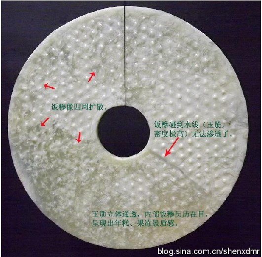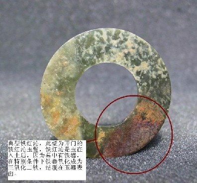 受铁或者土沁所致。受沁的程度有重有轻,重的地方还带有棕红或黑红的块状物。沁成这种程度需要千年以上的时间。