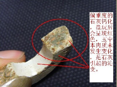 这是玉石的一种变质现象,多由氧化和复分解过程而形成比较疏松的物质,所以较为松脆,怕磕碰。这种钙化层就越厚。