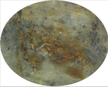 是指在玉的里面生成的点状、颗粒状的带色物质,就像玉的里面有大米饭粒、小米饭粒、玉米糁,有的还伴有粥状物。沁成这种情况,玉质疏松的600年即可,致密的需要2000年以上。