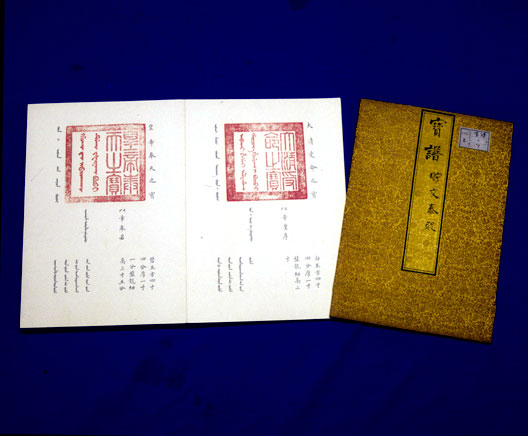 宝谱即皇帝宝玺之印谱。清乾隆十三年钦定御宝为二十五颗。因其用处不同,名称各亦。如:“皇帝之宝”、“制诰之宝”、“皇帝尊亲之宝”、“敬天勤民之宝”、“广运之宝”等。