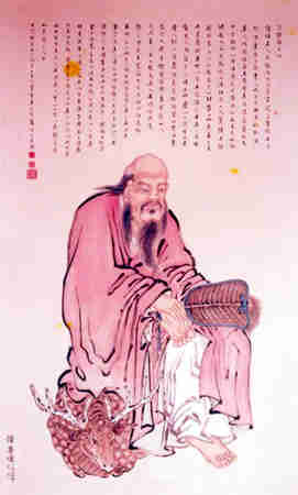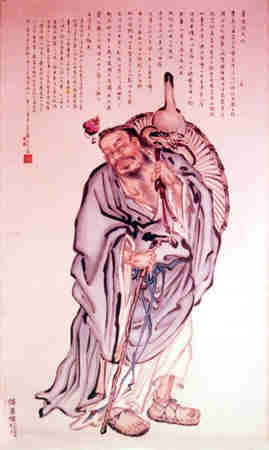 原复姓钟离,名权,后改名为觉,燕台人,字寂道,号和谷子,又号正阳子。全真道派尊其为"正阳祖师","北五祖"之一。钟离权神诞之日为四月十五日。相传诞生时,异光数丈,状若烈火。生下后不哭不食,第七日跃然而起曰:身游紫府,名书玉京。及长,为谏议大夫,奉诏北征失利,军士尽散。钟离权独骑奔谷迷道,路遇王玄甫授以长生真诀及金丹火候、青龙剑法等。后入华山、入崆峒山,见老君,赐号云房。唐时,因受铁拐李的点化,汉钟离上山学道。下山后用点石成金之术救济群众,而手常持蒲扇。钟离权自称"天下都散汉钟离",后人之称为"汉钟离"。钟离权梳髻以传道,手摇扇子,袒露大肚,一派散仙之风。